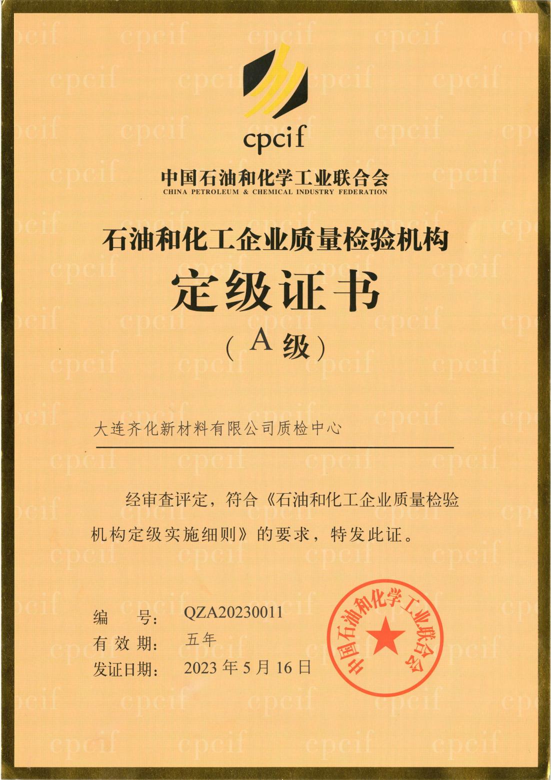 近日,公司質檢中心經審查評定,符合《石油和化工企業質量檢驗機構定級實施細則》的要求,被中國石油和化學工業聯合會授予“石油和化工企業質量檢驗機構定級證書-A級”。